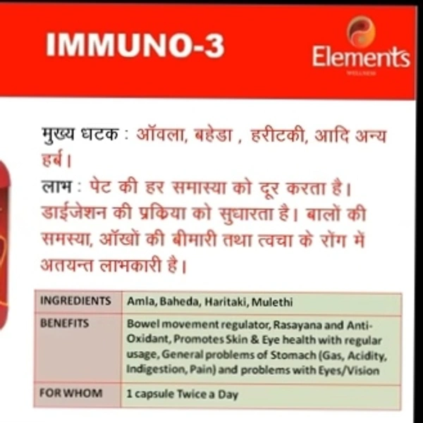 किसके लिए : पेट की सामान्य समस्याएं ( गैस , एसिडिटी , अपच , दर्द ) और आंख / दृष्टि की समस्या प्रमुख सामग्री : आंवला , बहेडा , हरिताकी , मुलेठी लाभ : बॉउल मूवमेंट रेगुलेटर , रसायण और एंटी ऑक्सीडेंट , नियमित उपयोग के साथ त्वचा और नेत्र स्वास्थ्य को बढ़ावा देता है उम्र क्या है : 15 साल कैसे उपयोग करें : 1 कैप्सूल प्रतिदिन दो बार या चिकित्सक द्वारा निर्देशित कब : सुबह और शाम । खाली पेट न लें । पैक आकार : 60 शाकाहारी कैप्सूल