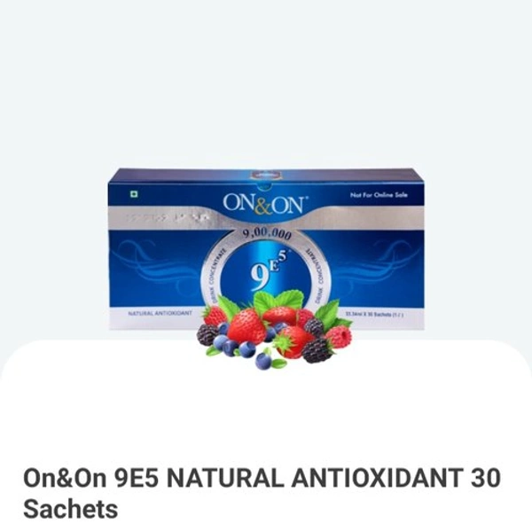 On & On 9E5 NATURAL ANTIOXIDANT 30 Sachets अनेक फायदे : - किडनी को तंदरुस्त रखता है | दांतो को मजबूत बनता है | लिवर की सुरक्षा करता है | आंखों को तंदरुस्त रखता है | • पाचन क्रिया सुधारता है | रोग प्रतिरोधक शक्ती बढाता है | लाल रक्तकन को बढाता है | जोडो के दर्द में राहत देता है | -थायरॉइड ठीक करने में सहायक है | कैंसर और हार्टएटॅक जैसी बिमारीयों से लग्ने में सहायक है | अस्थमा के लिए लाभदायक है | संपूर्ण शरिर को रोग मुक्त रखता है | स्फुर्ती प्रदान करता है | सेक्स जीवन बेहतर बनाता है | पीने का तरीका . : - दिन में 2 पाउच लेना है | सुबह नास्ते से पहले 150 ml पाणी के साथ ] पाउच खाली पेट लेना है । रात को खाना खाने से 2 घंटे पहले पाउच लेना है | नोट- : ( 12 साल से छोटे बच्चों और गर्भवती एवं स्तनपान कराने वाली महिलाओं के लिये नही